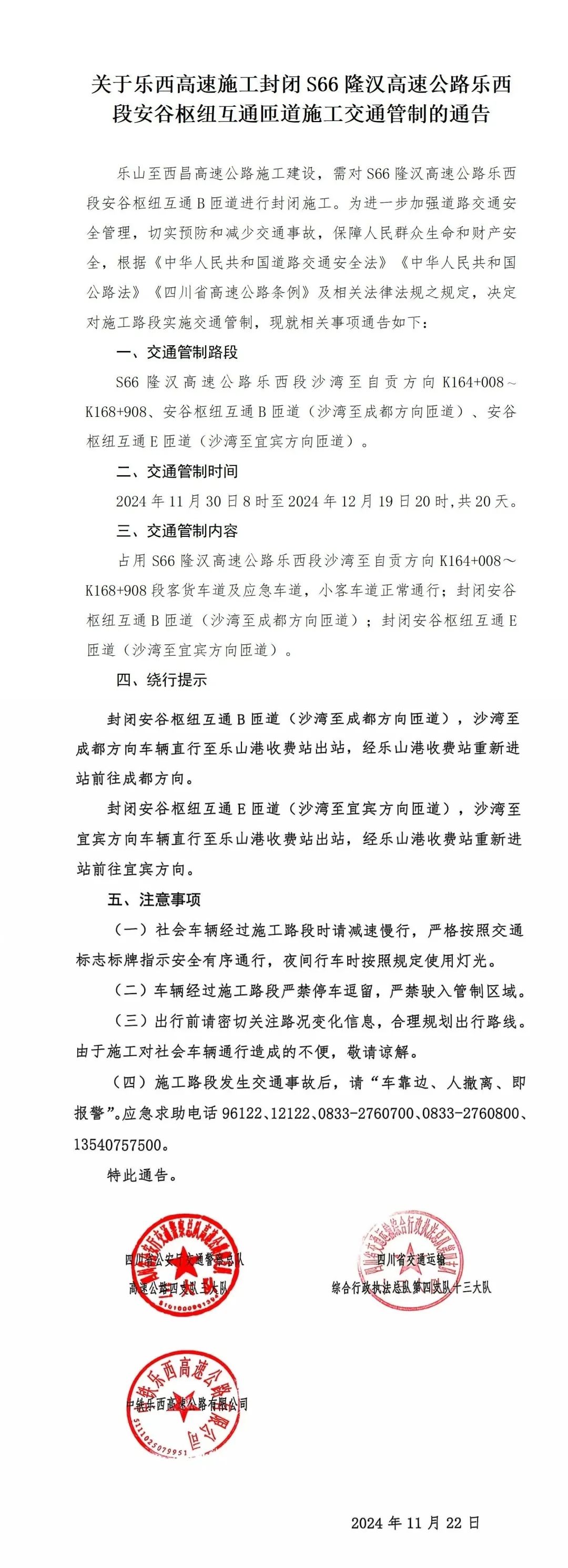 关于乐西高速施工封闭s66隆汉高速公路乐西段安谷枢纽互通匝道施工交通管制的通告 -k8凯发天生赢家一触即发人生