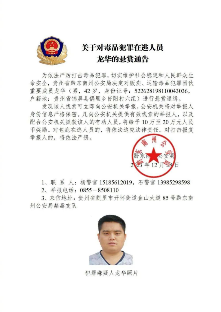 发现该人线索可立即向公安机关举报,公安机关将对举报人身份信息严格保密。凡向公安机关提供有效线索的举报人,以及配合公安机关抓获该人的有功人员,将给予10万至20万元人民币奖励。对包庇在逃人员的,将依法追究法律责任。对打击报复举报人的,将依法严惩。