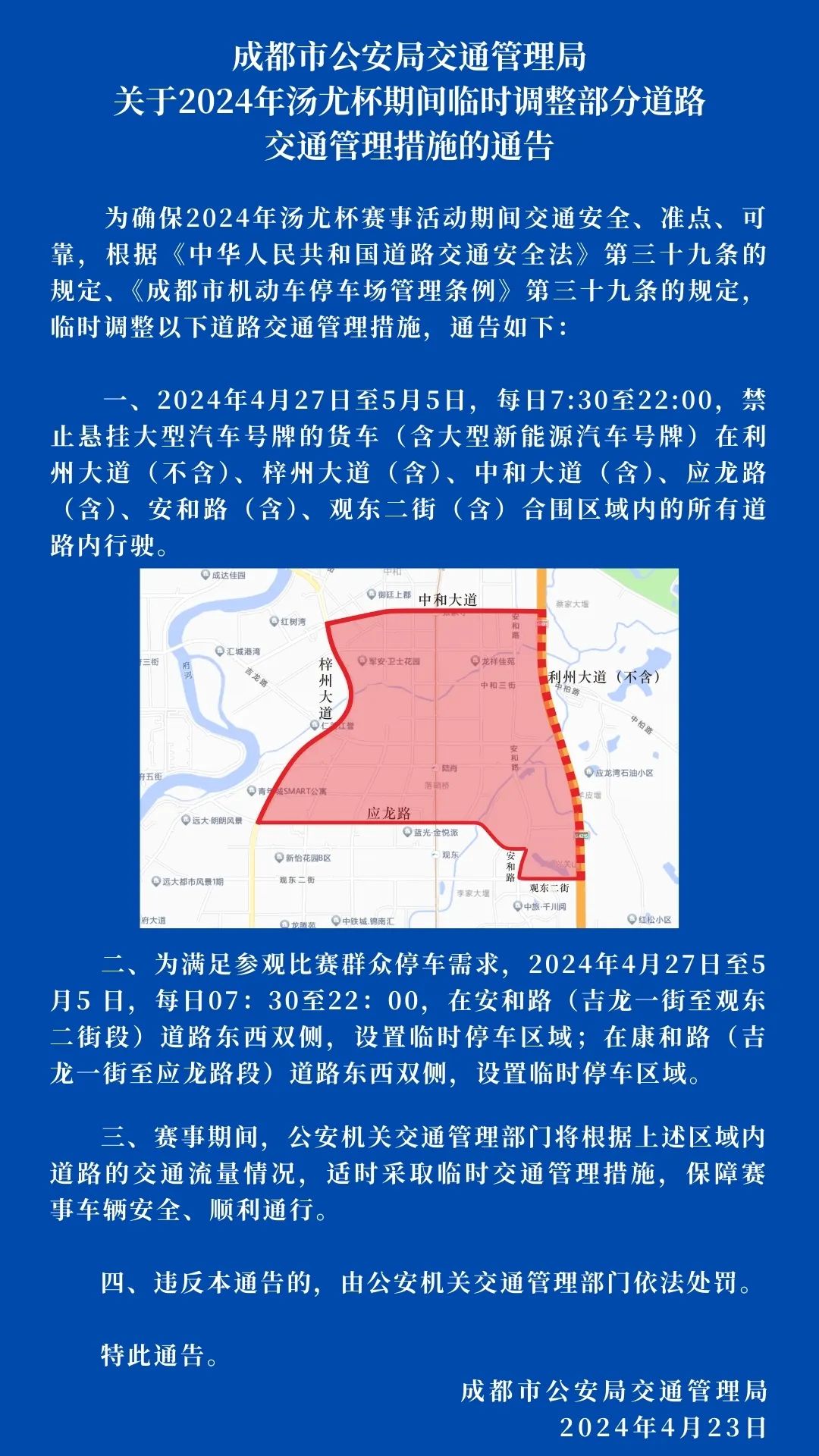 关于2024年汤尤杯期间临时调整部分道路交通管理措施的通告 -k8凯发天生赢家一触即发人生