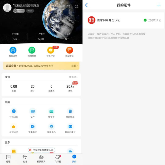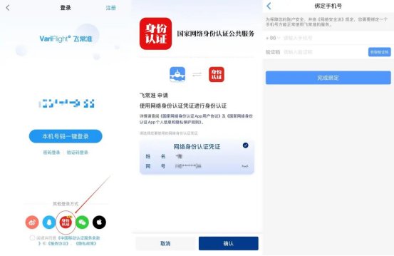 以某航旅app为例,点击“国家网络身份认证”图标进行关联登录,便可以不再输入身份证号码。登录完成后,点击证件可看到显示已用国家网络身份认证完成认证。