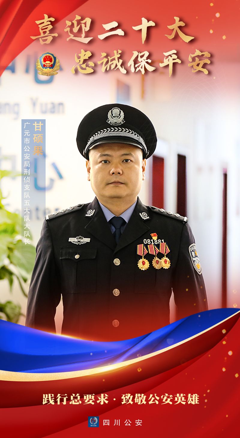 甘硕果,男,现任广元市公安局刑侦支队拐卖妇女儿童犯罪侦查大队大队长、四级警长。曾荣立个人三等功4次,个人嘉奖2次,获评全省公安机关标兵个人、全省特级优秀人民警察,2015年被四川省公安厅评为侦查措施运用业务能手,2020年入选四川省打击电信网络诈骗专家人才库,2022年荣获全国公安机关爱民模范。