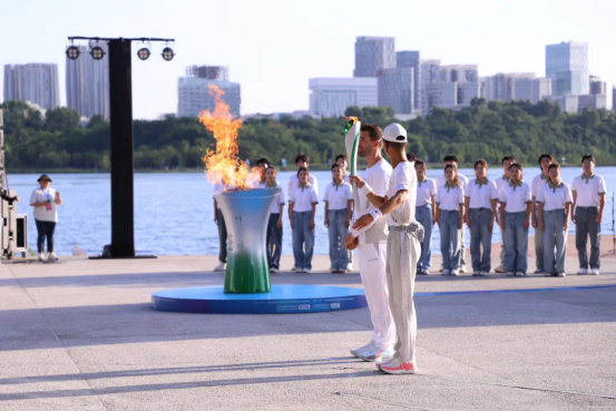 2025年7月26日傍晚,兴隆湖湖面波光粼粼。17时30分许,成都世运会圣火传递的最后一站在天府新区规划厅前的“新时代、新天府”草坪举行。圣火点燃,“竹梦”火炬沿环湖绿道向4公里外的终点——兴隆湖路演艺术中心跃动。