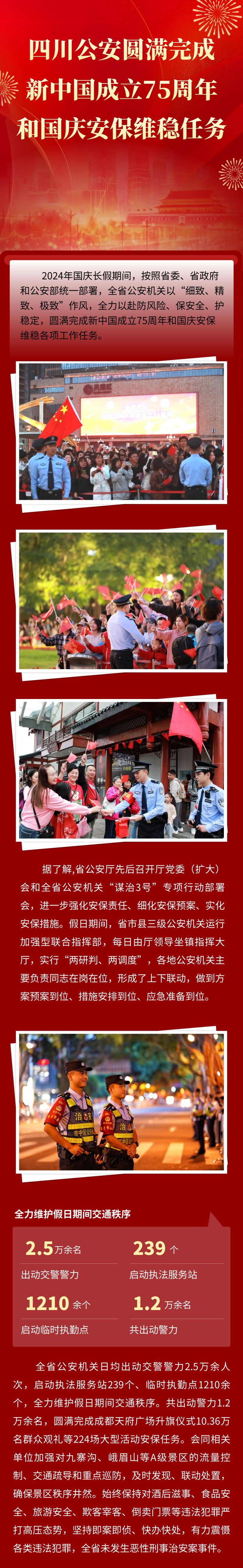 全省公安机关日均出动交警警力2.5万余人次,启动执法服务站239个、临时执勤点1210余个,全力维护假日期间交通秩序。共出动警力1.2万余名,圆满完成成都天府广场升旗仪式10.36万名群众观礼等224场大型活动安保任务。会同相关单位加强对九寨沟、峨眉山等a级景区的流量控制、交通疏导和重点巡防,及时发现、联动处置,确保景区秩序井然。始终保持对酒后滋事、食品安全、旅游安全、欺客宰客、倒卖门票等违法犯罪严打高压态势,坚持即案即侦、快办快处,有力震慑各类违法犯罪,全省未发生恶性刑事治安案事件。