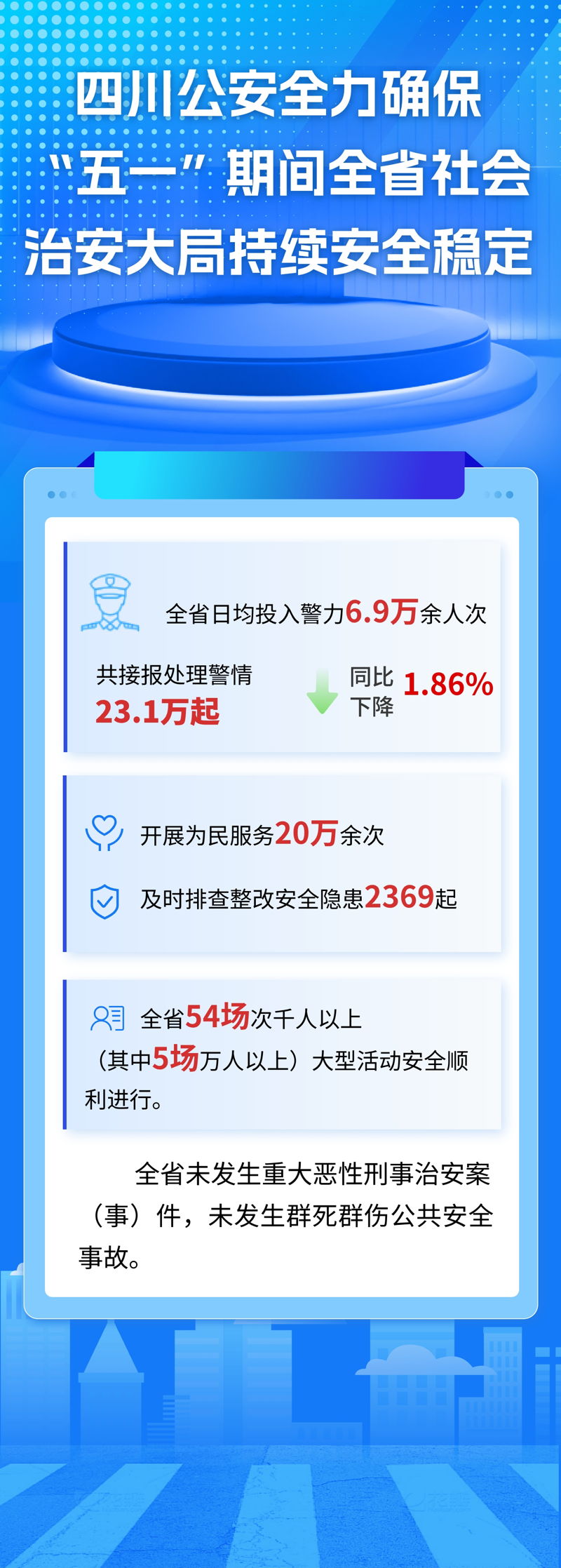 “五一”期间,四川公安按照省委、省政府、公安部部署要求,全省公安机关执行高等级勤务,深入开展“谋治2号”专项行动,全力确保了全省社会治安大局持续安全稳定。全省日均投入警力6.9万余人次,共接报处理警情23.1万起,同比下降1.86%,开展为民服务20万余次,及时排查整改安全隐患2369起,全省54场次千人以上(其中5场万人以上)大型活动安全顺利进行。全省未发生重大恶性刑事治安案(事)件,未发生群死群伤公共安全事故。