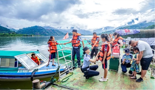图为攀枝花市公安民警护航二滩水库库区学生平安上学